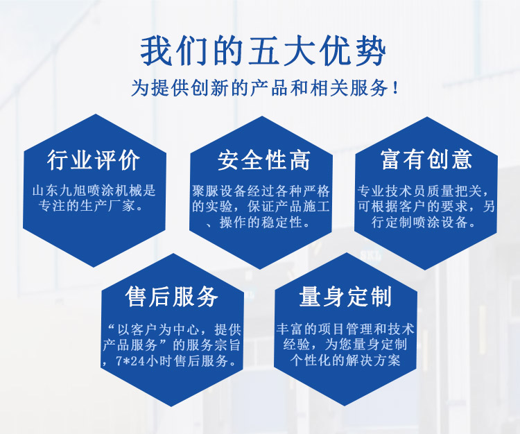 山東九旭機(jī)械科技有限公司歷經(jīng)十幾年的發(fā)展,已成長(zhǎng)為液壓聚脲設(shè)備行業(yè)頗具實(shí)力的設(shè)備制造業(yè)之一。主要產(chǎn)品:聚氨酯高壓噴涂機(jī)、聚氨酯高壓發(fā)泡機(jī)、液壓聚脲噴涂設(shè)備及設(shè)備配件(聚氨酯高壓噴槍、槍嘴、加熱管道、料塊、摩擦副、增壓泵、混合式、提料泵等)也是堅(jiān)持最好的質(zhì)量服務(wù)用戶,